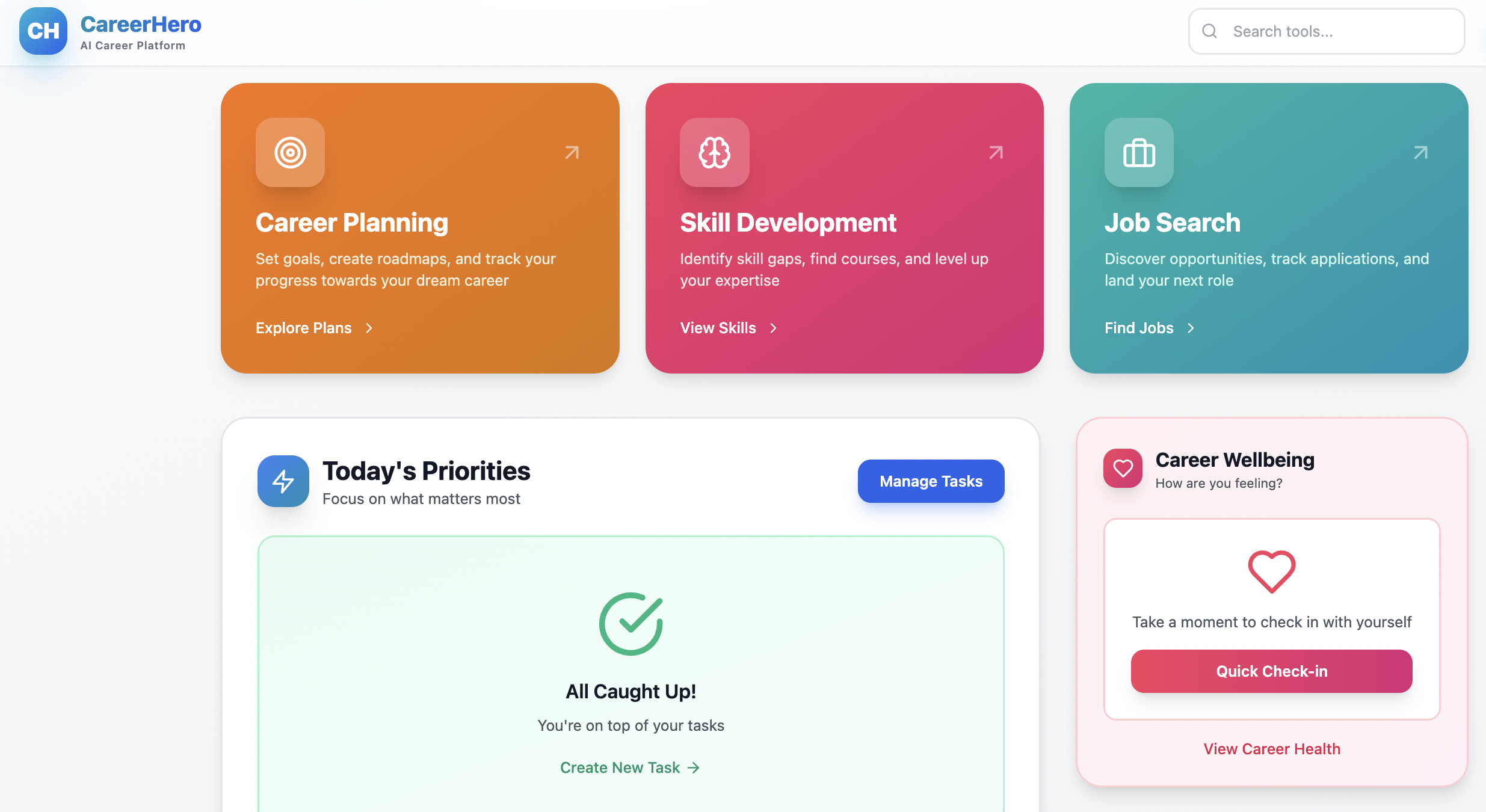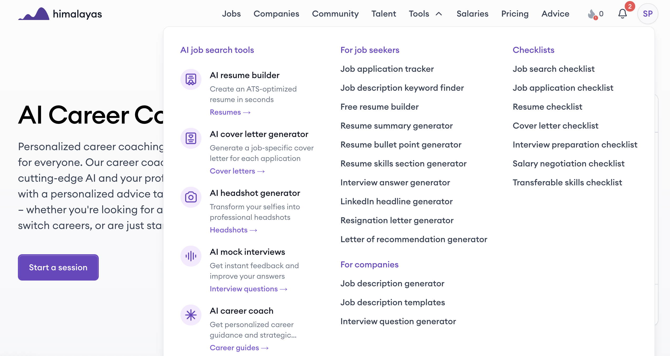 When I first signed up, I was surprised by how feature-rich the platform is. It offers a wide range of tools — checklists (resume, job search, etc.), generators (resume summary, skills, interview questions), and even AI tools for resume creation, including an AI Career Coach. However, the AI Career Coach functions more like a conversational chatbot that answers your questions rather than a true coaching assistant that guides you and visually maps out your potential next steps.