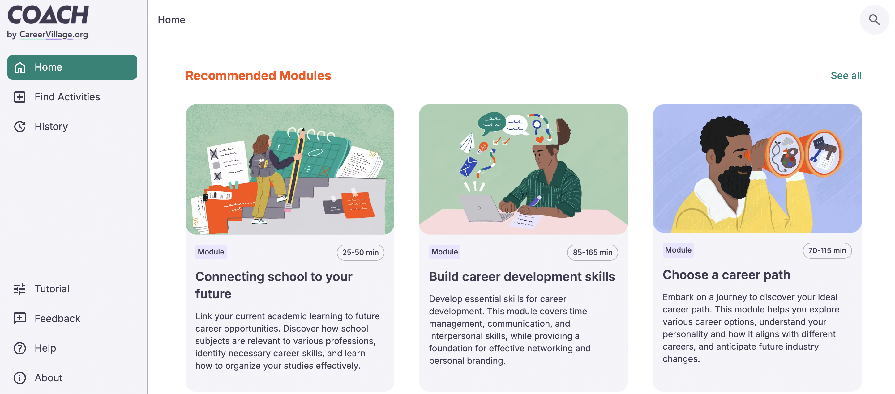 AICareerCoach.org works on a system of modules and activities, each covering different career-related topics and questions.